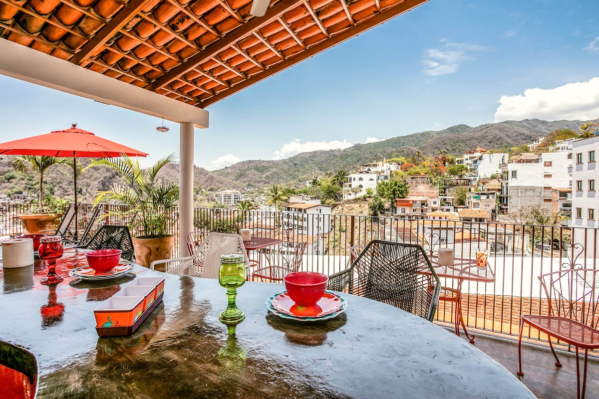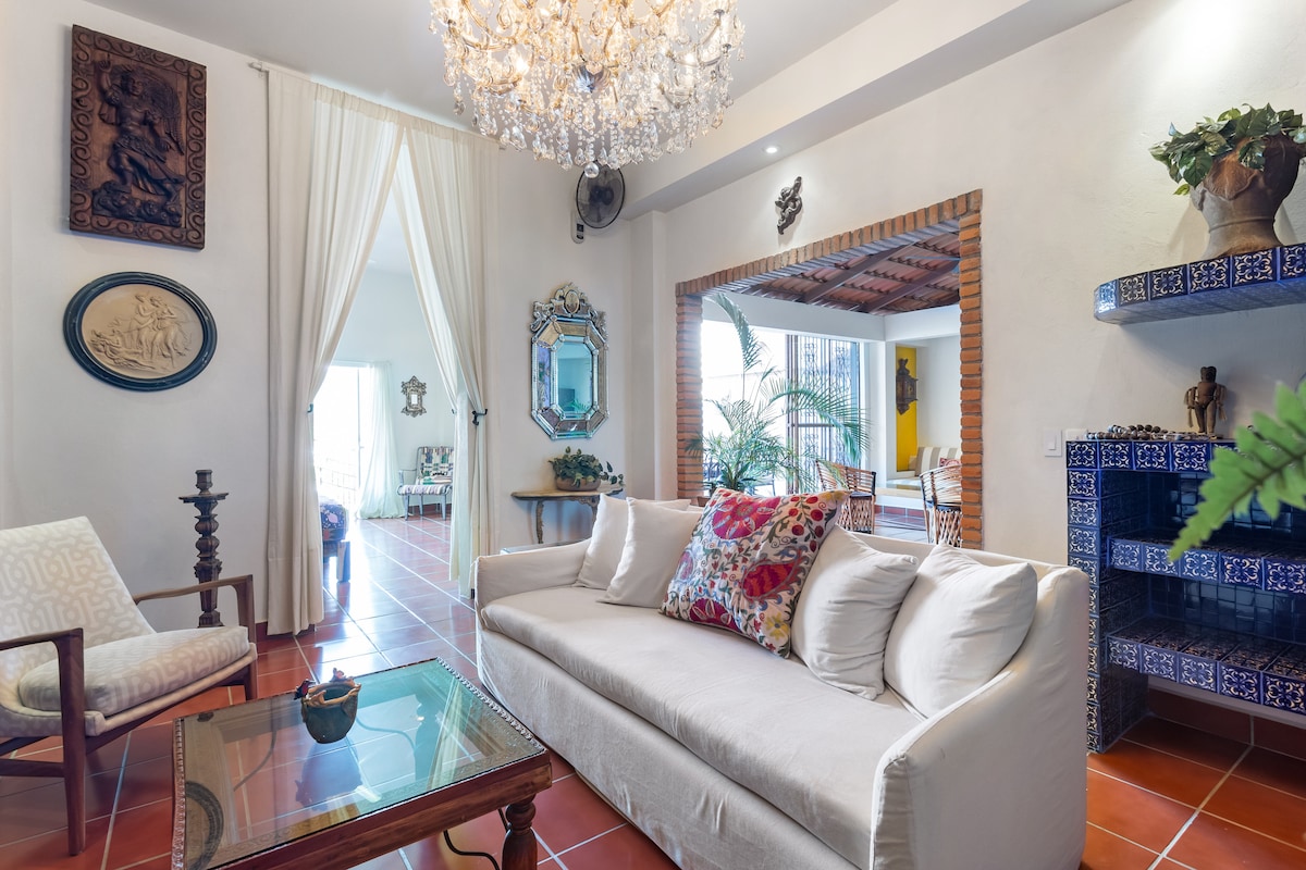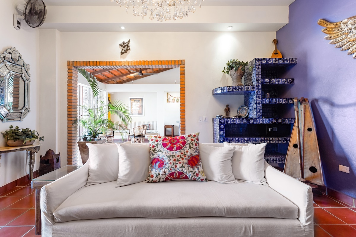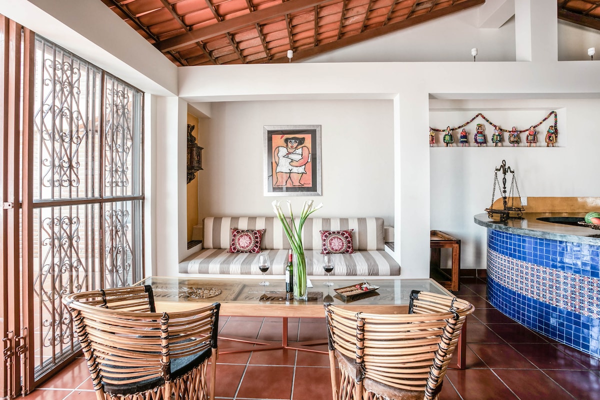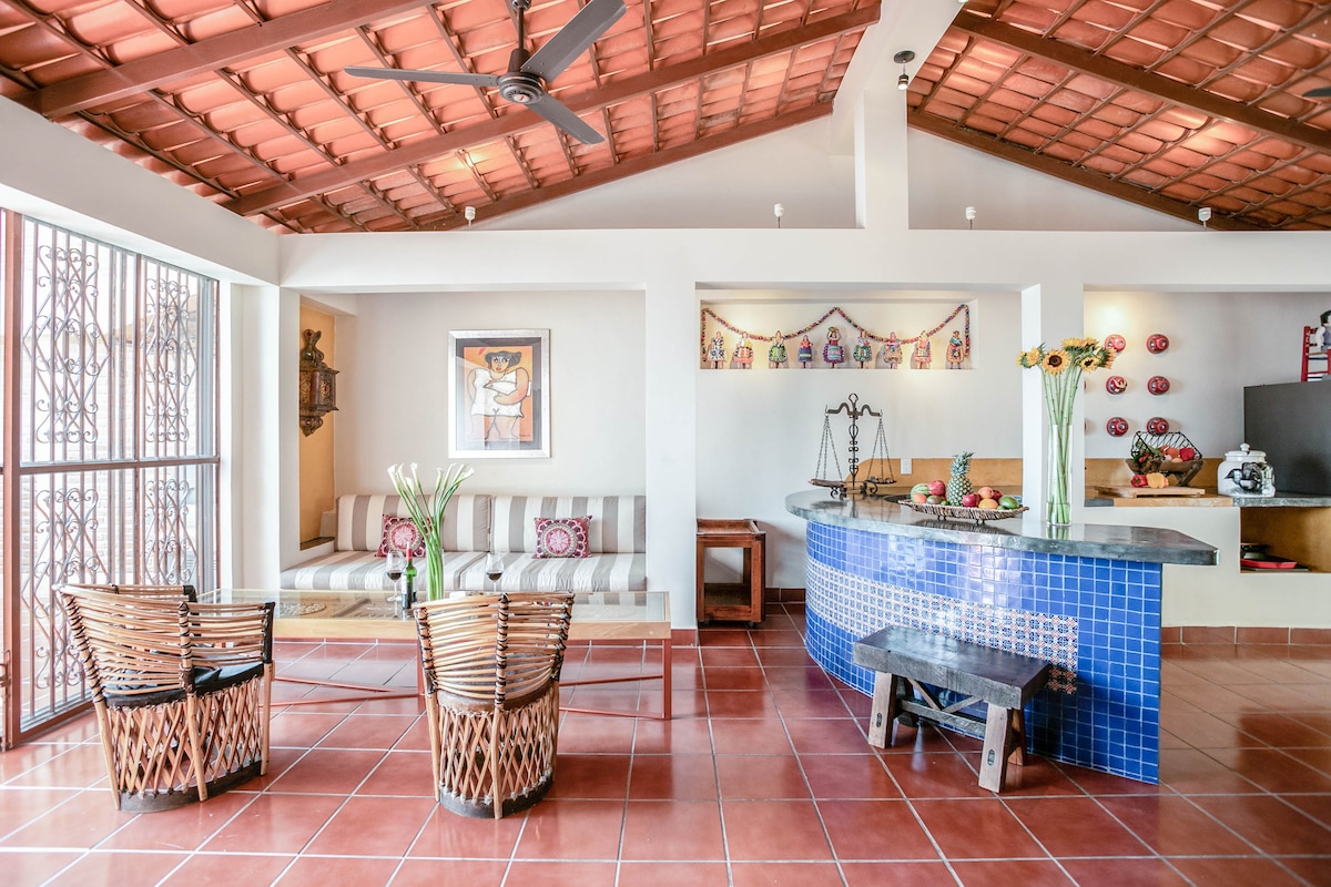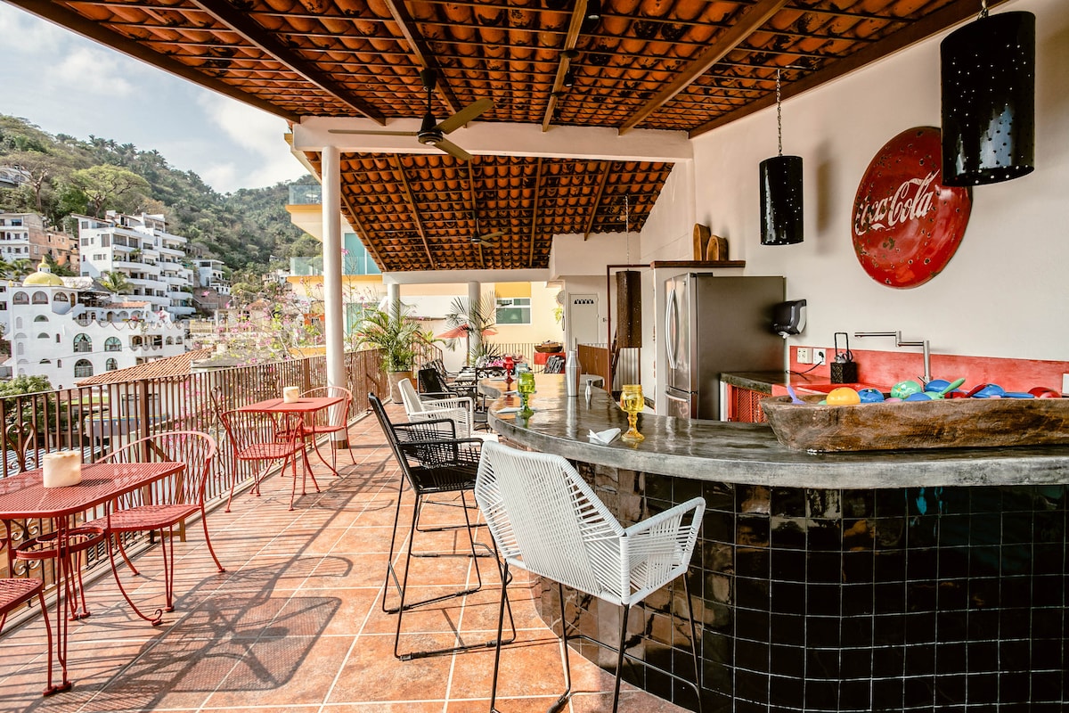 Puerto VallartaEmbrace the authenticity of this stylishly decorated Romantic Zone Villa. Rich colors & terracotta tile work give a pop of personality to the Chef's kitchen & outdoor patio perfect for hosting a dinner party. An inner courtyard with manicured gardens, rooftop pool/bar & stunning views of the Bay will truly amaze. Our cleanliness & your safety have always been a top priority at Villa Colibrí MX.