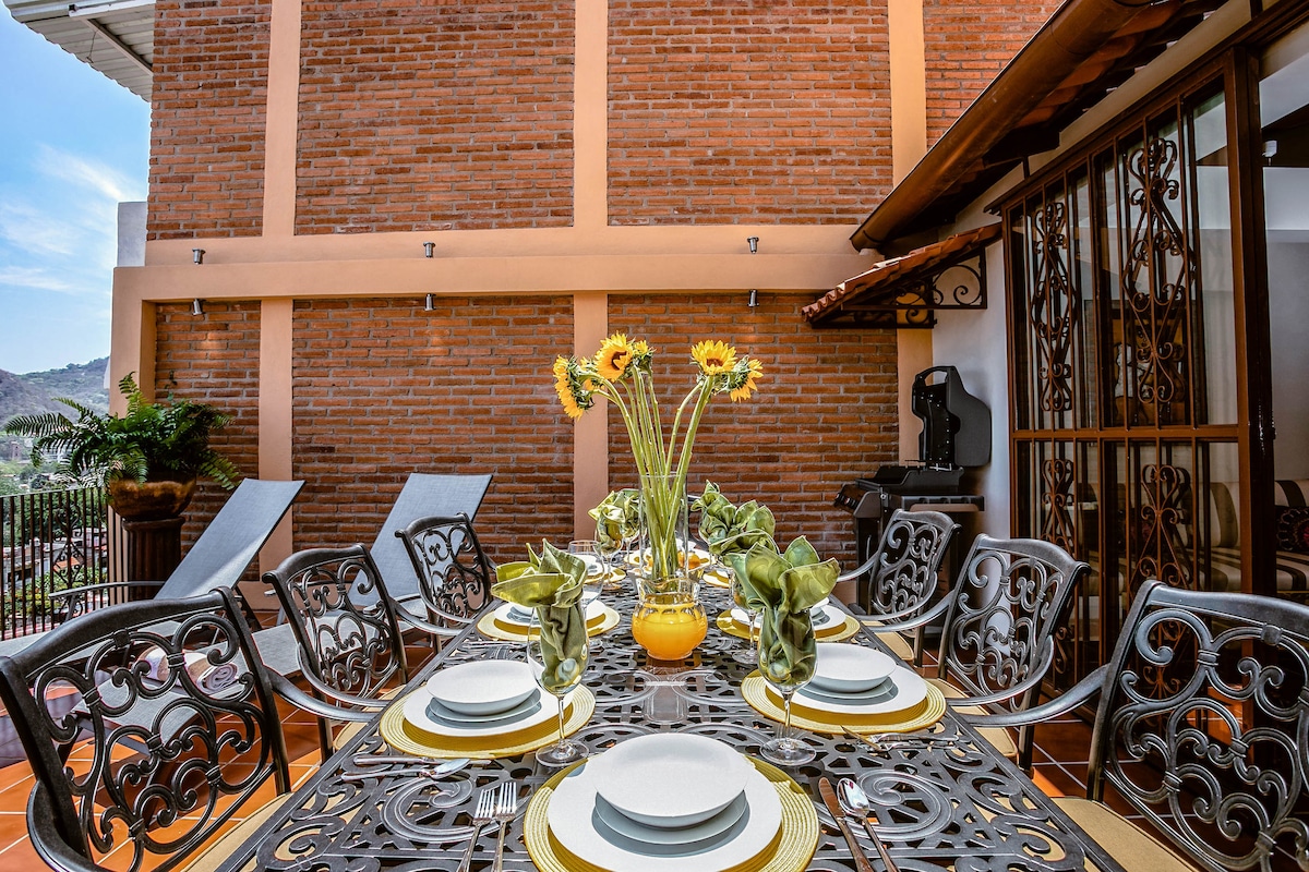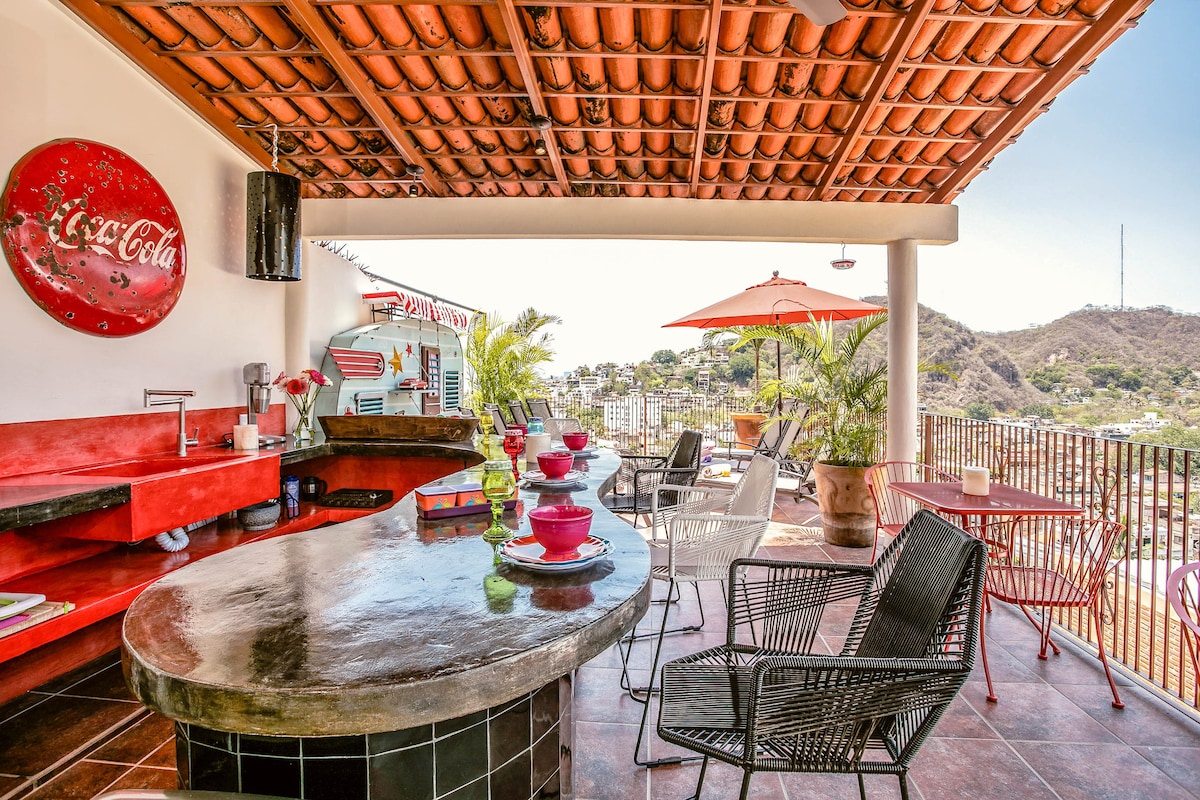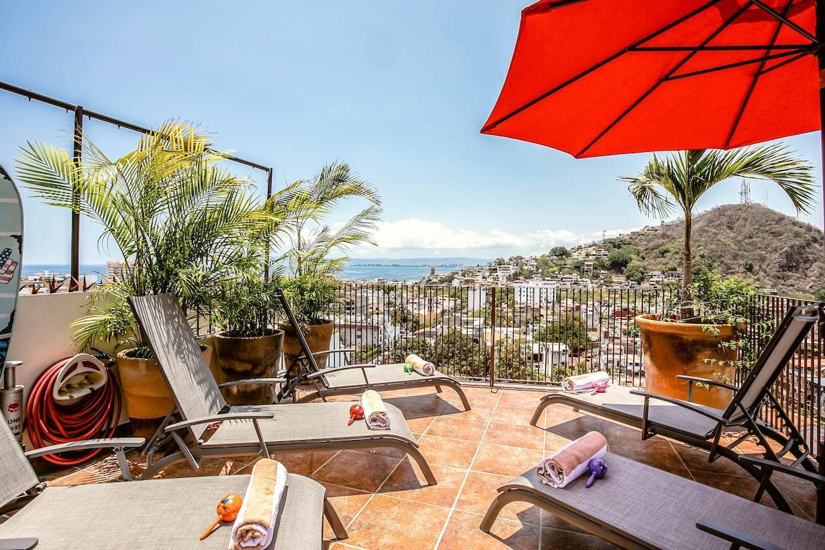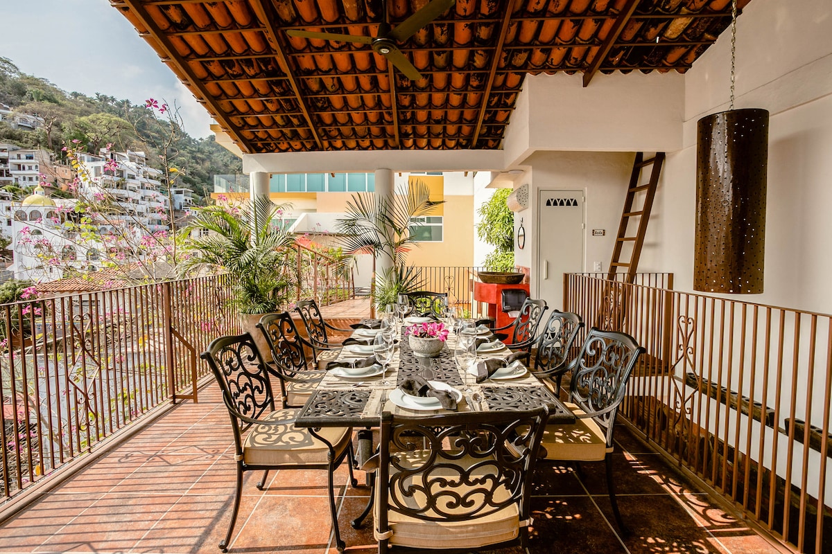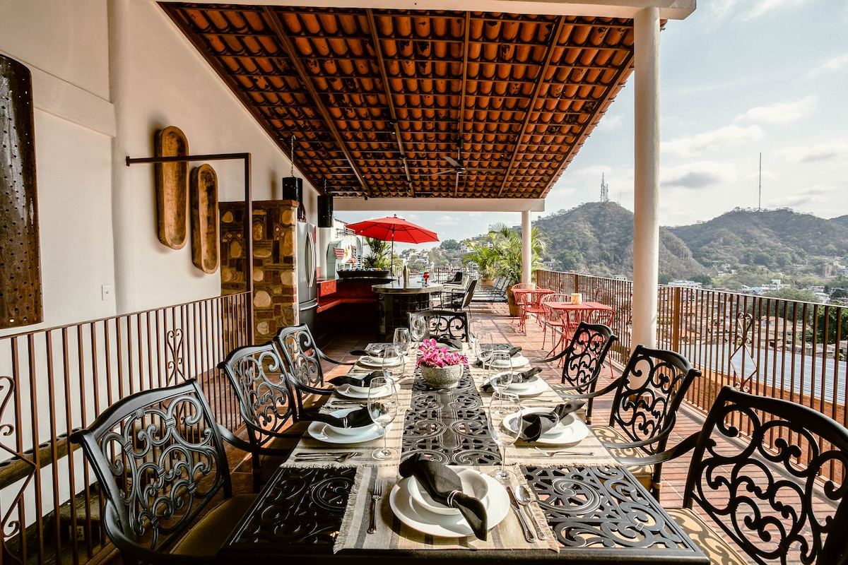 Puerto VallartaEmbrace the authenticity of this stylishly decorated Romantic Zone Villa. Rich colors & terracotta tile work give a pop of personality to the Chef's kitchen & outdoor patio perfect for hosting a dinner party. An inner courtyard with manicured gardens, rooftop pool/bar & stunning views of the Bay will truly amaze. Our cleanliness & your safety have always been a top priority at Villa Colibrí MX.